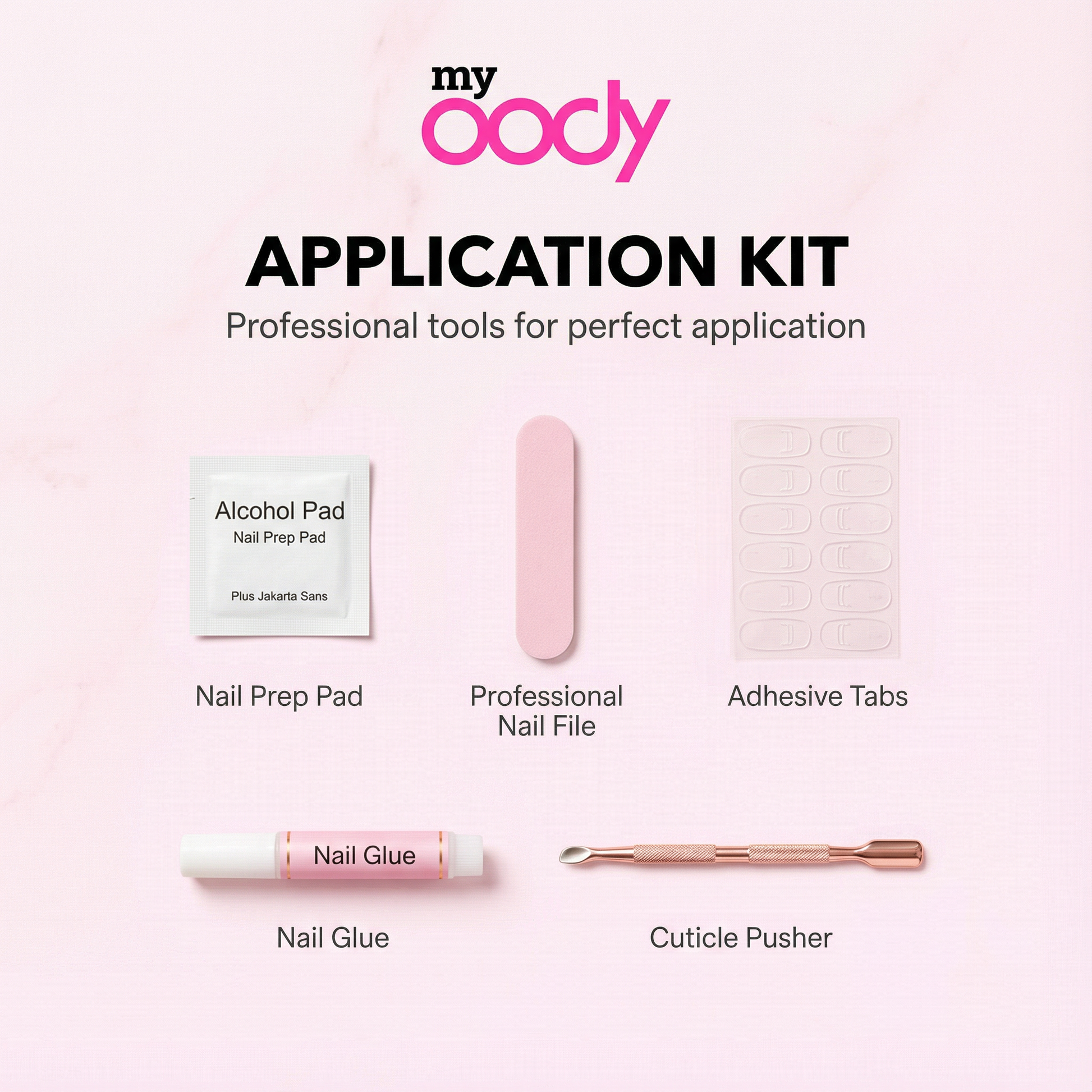 Clean your natural nails, push back cuticles, select the right size for each nail, apply adhesive tab or glue, press firmly for 10-15 seconds. Done! Full instructions included in every set.