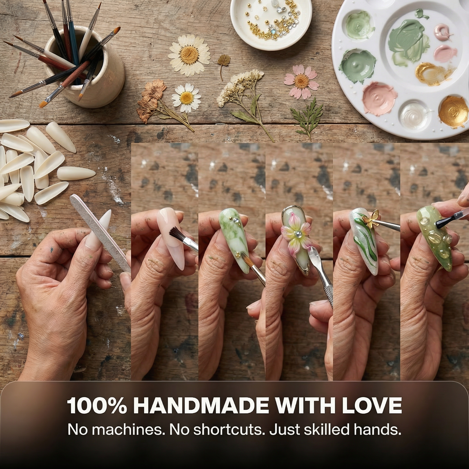 True luxury is made by hand. Our Vietnamese artisans dedicate hours to perfecting every set — because you deserve nails crafted with the same care as fine jewelry.